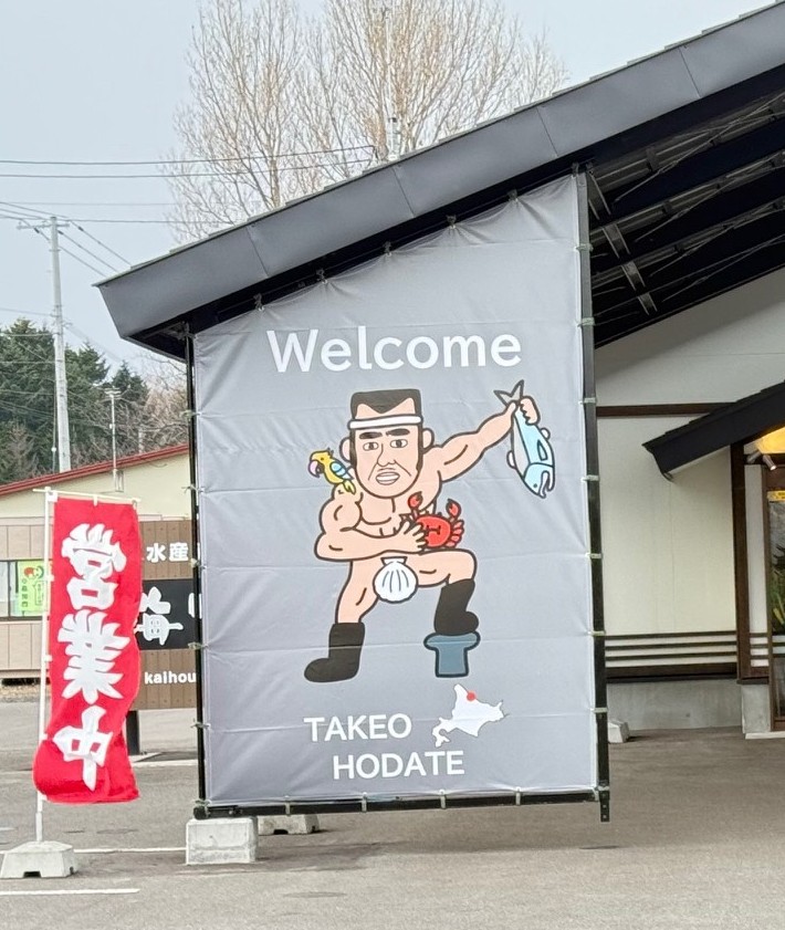 イメージキャラクターの「帆館武雄(ほだてたけお)」さんも目立ちますね!こちらの広告シートのサイズはW2220xH3620(mm)で、中ほどに横一線で溶着加工をしています。ハトメのピッチは450㎜です。